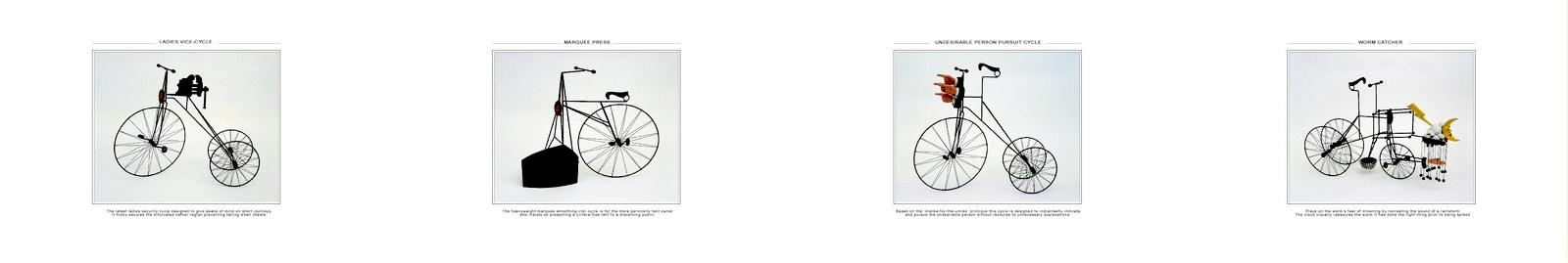 illustrating four different models of Wilf Lunn surreal cycles / bikes